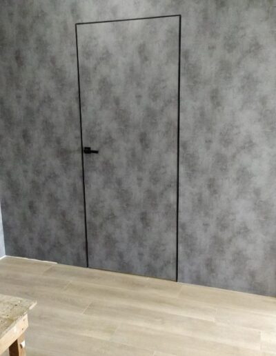 Эффект практически полной невидимости двери достигается за счет ее конструктивных особенностей. Дверная коробка изготовлена из специального алюминиевого профиля который, в дальнейшем, можно обшить гипсокартоном и окрасить. В конструкции используются скрытые петли они устроены таким образом что не имеют видимой части снаружи двери.